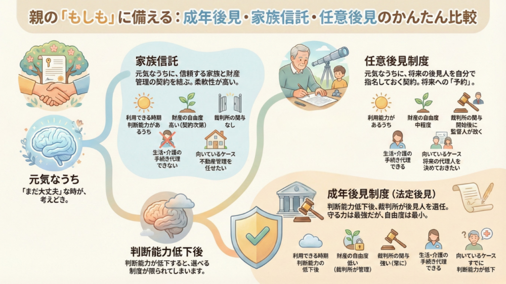 成年後見制度・家族信託・任意後見 の3つを、「家族が後悔しにくい視点」で比較していきます。