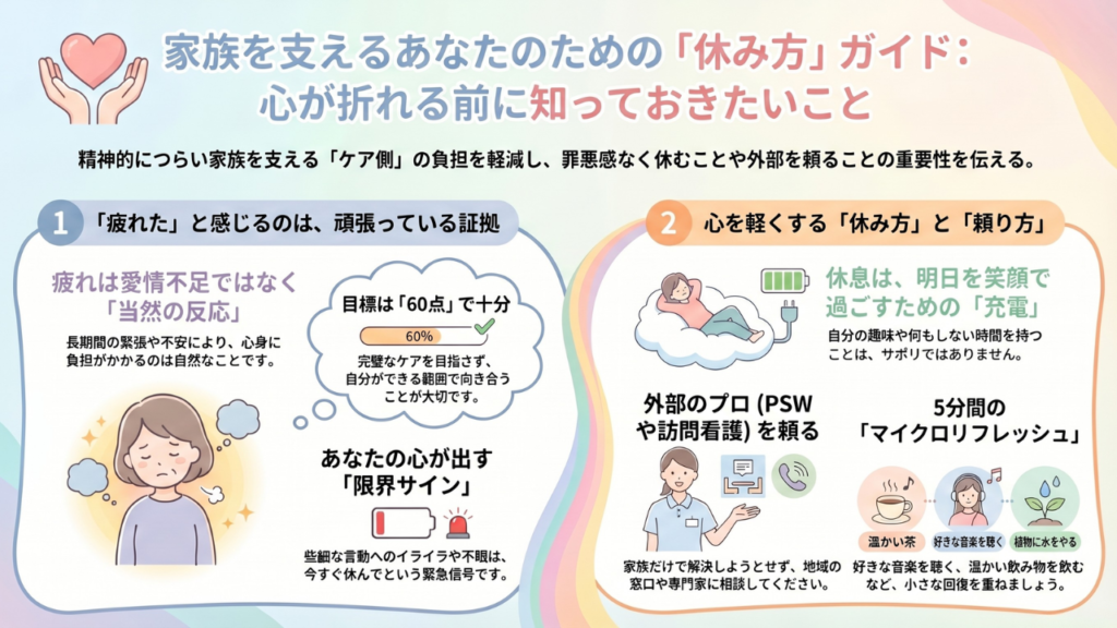 家族だからこそ「自分がやらなきゃ」と思いがちですが、あなたは医療のプロ(主治医)ではありません。 完璧にケアをしようとせず、👉 「できる範囲で(60点くらいで)十分」 と自分に言い聞かせてください。