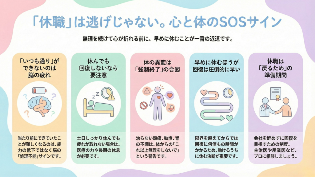 無理をして倒れて退職してしまうよりも、 👉 一度立ち止まってしっかり治すこと が、結果的にあなたの人生において長く健やかに働くことにつながります。