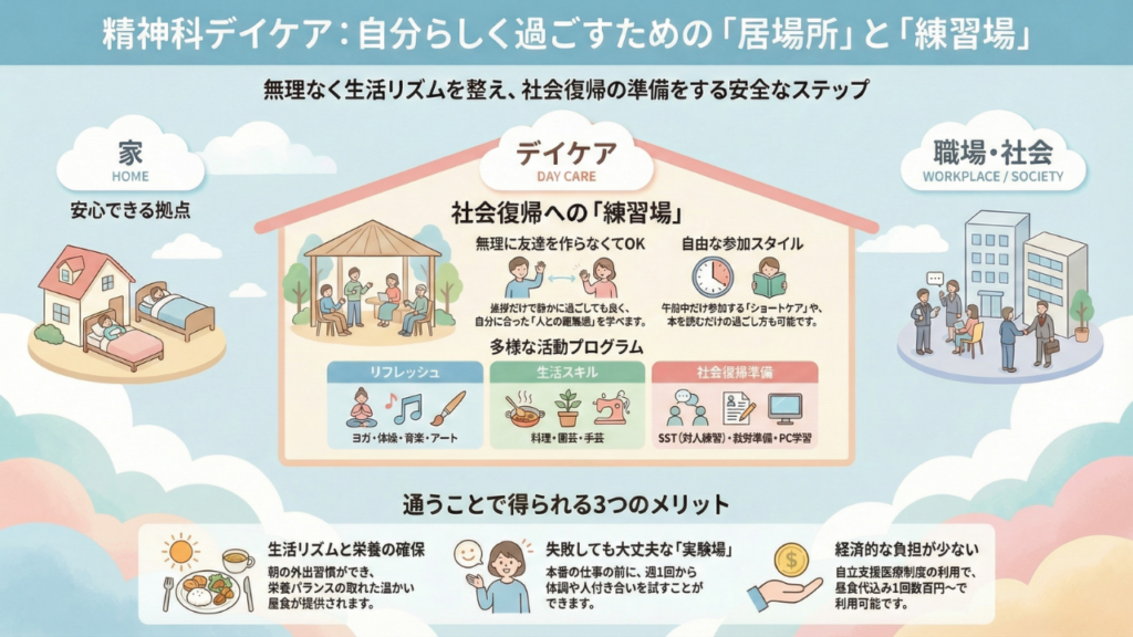 精神科デイケアは、病院やクリニックなどが提供する 「日中の通いのリハビリ(居場所+回復支援)」です。