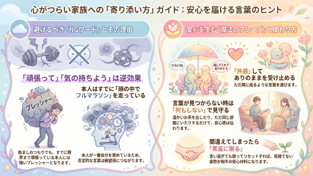 - 👉 「頑張って」「気の持ちよう」など、本人を追い詰める言葉は避ける
